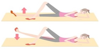 ※横向きで上の足を立てて下の足のかかとからゆっくり持ち上げる(股関節・内転筋)